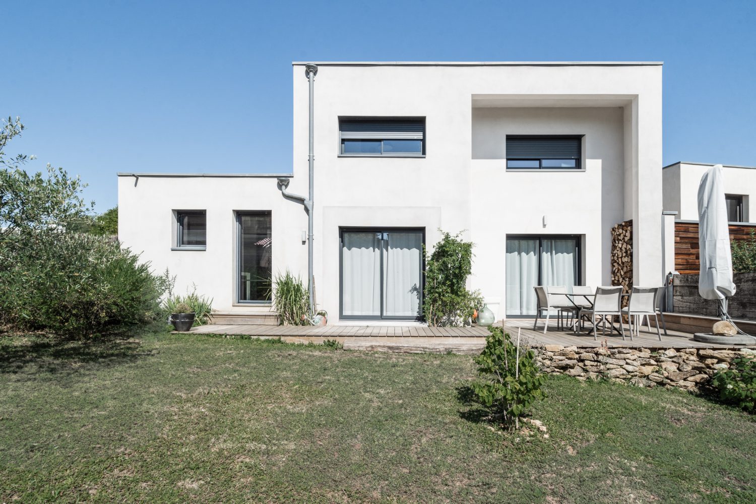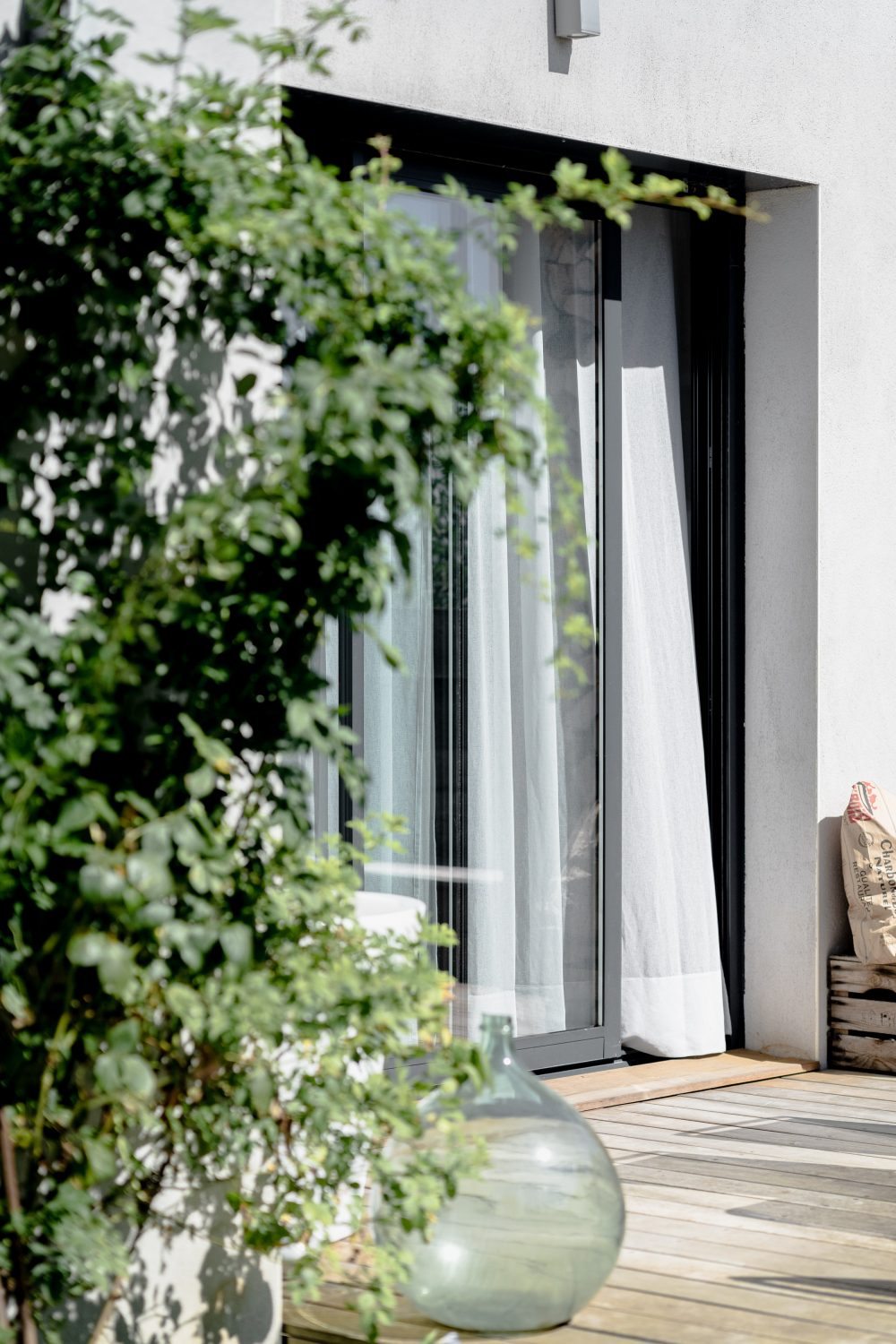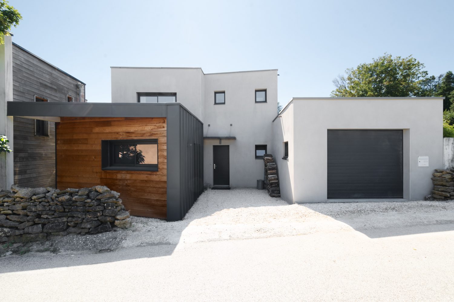 La première extension, dans la continuité du bâti d’origine, agrandit le garage et intègre un nouvel espace buanderie. Fidèle à l’esthétique de la maison, elle adopte une toiture terrasse, un enduit clair et des menuiseries gris anthracite, mises en valeur par des appuis de fenêtre en aluminium laqué.