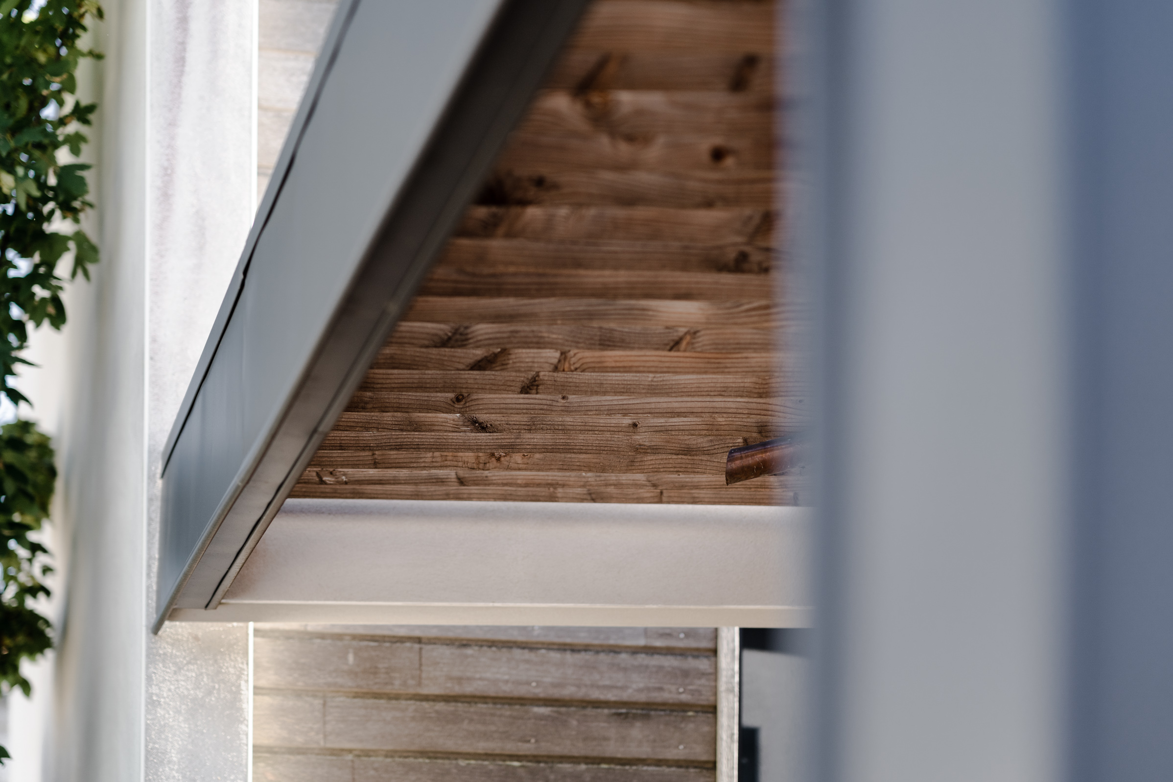 Trois ouvertures verticales ponctuent la façade, apportant lumière naturelle et perspectives tout en préservant l’intimité des espaces de vie.