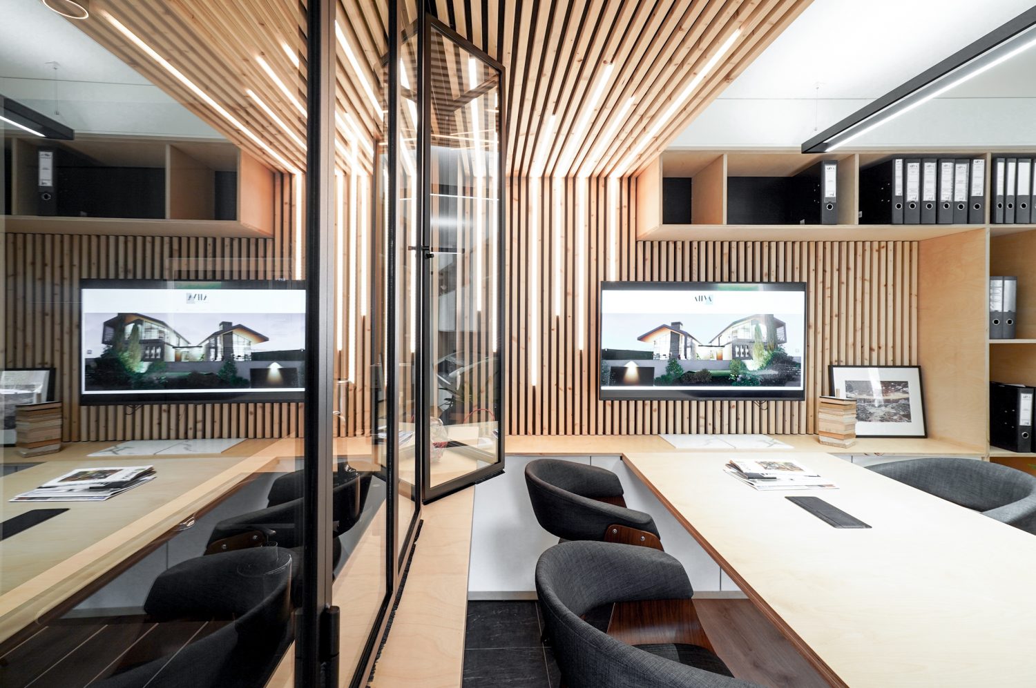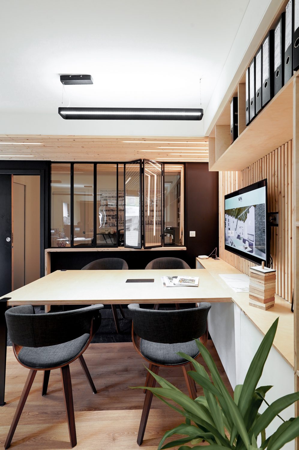 En continuité avec les éléments menuisés, un espace de réunion a été aménagé. Il est équipé d’une grande table et d’un écran de projection, permettant aux architectes de présenter les maquettes numériques des projets aux clients et partenaires.