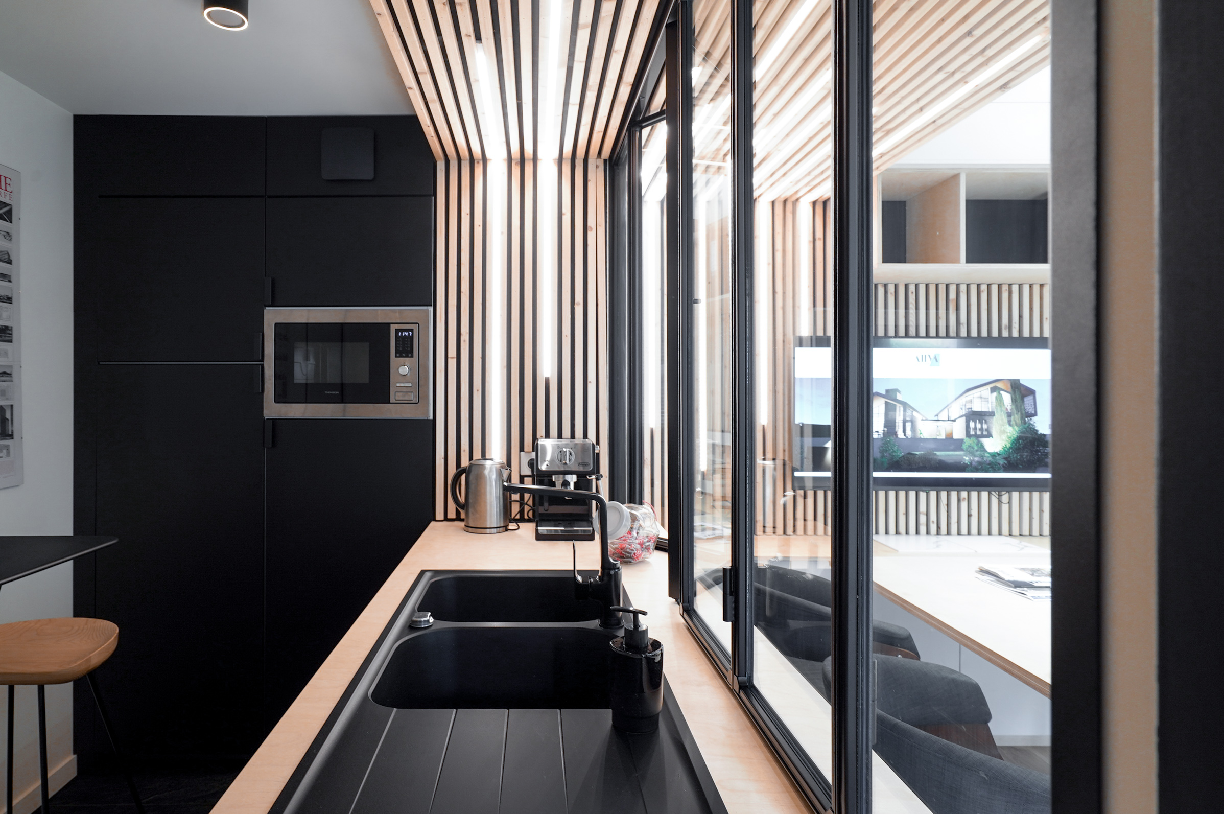 Une zone intermédiaire, intégrant une cuisine et des toilettes, sépare l’open space du reste du local. Cette zone est délimitée par une grande verrière amovible, qui apporte à la fois transparence et flexibilité. Lorsqu’elle est ouverte, elle transforme la cuisine en un véritable espace de convivialité avec une fonction bar.