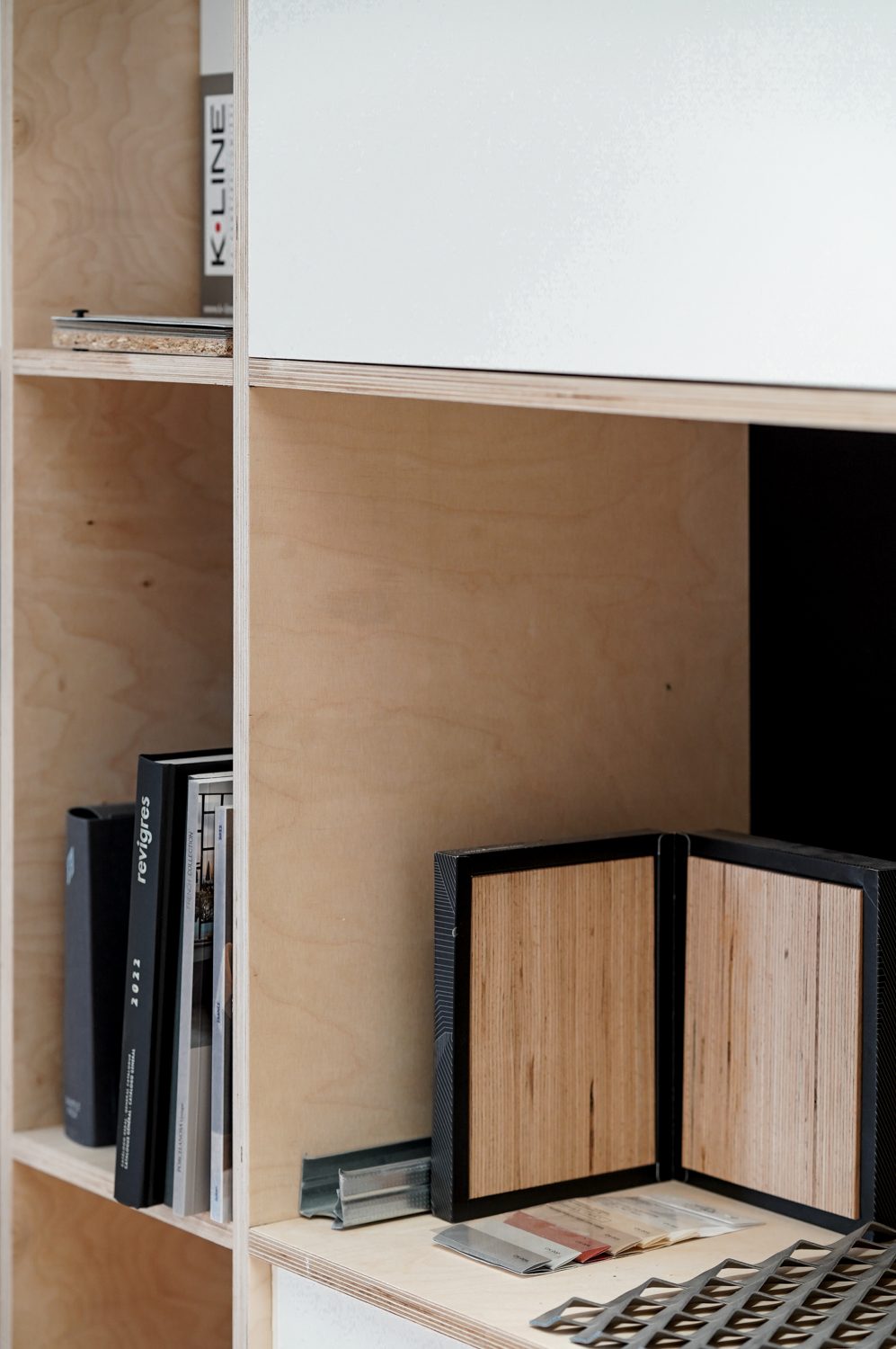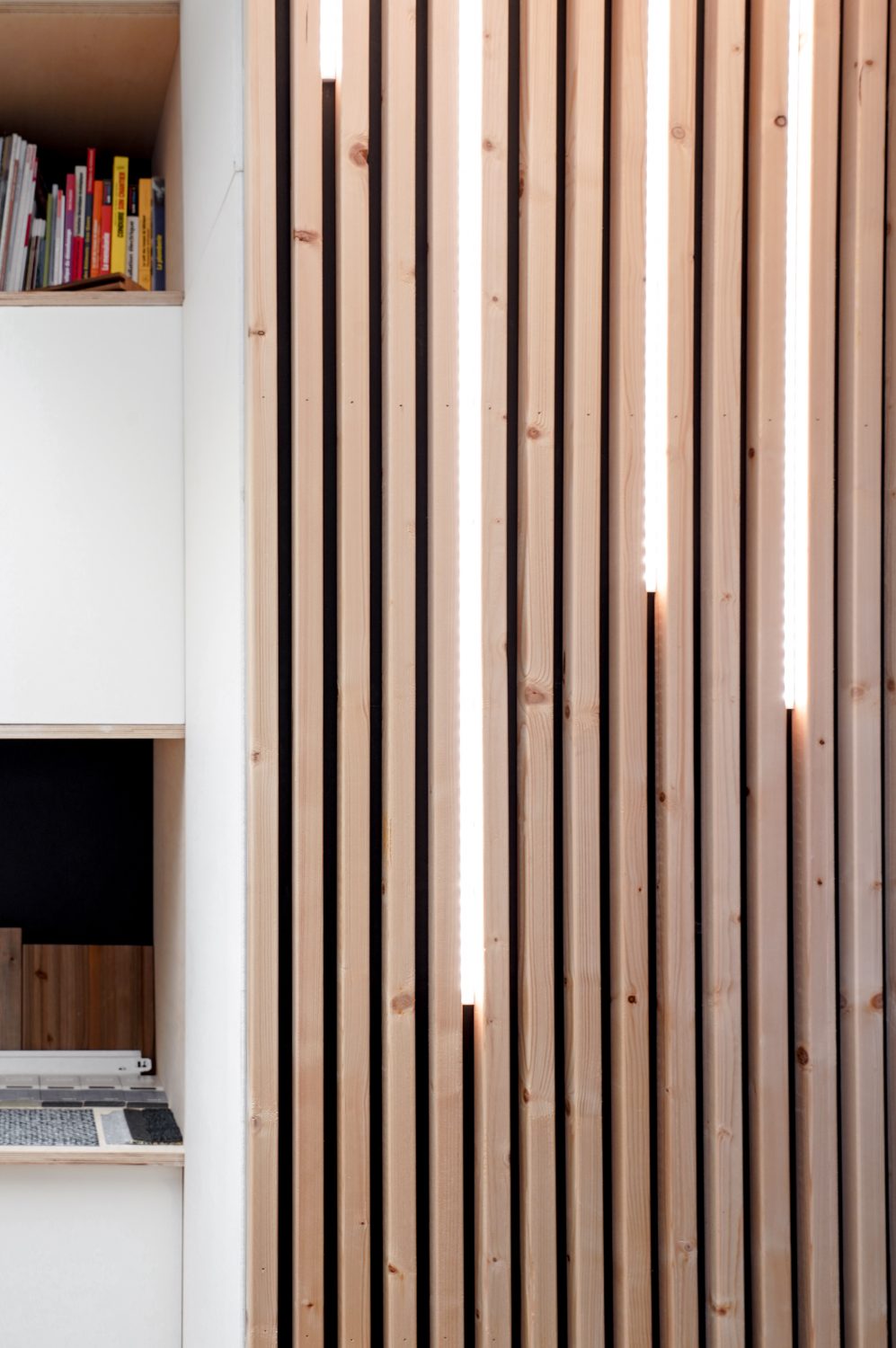 Dans le fond de l’open space, un meuble sur mesure en contreplaqué de bouleau structure l’espace et remplit plusieurs fonctions essentielles :