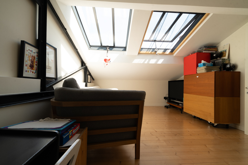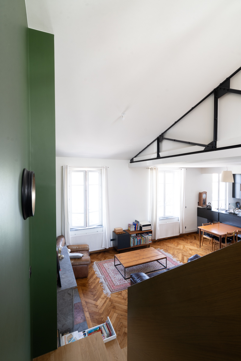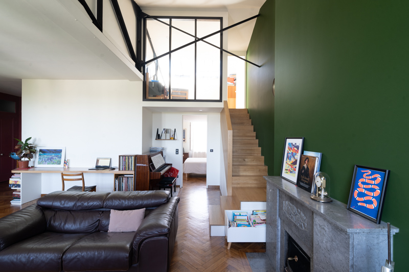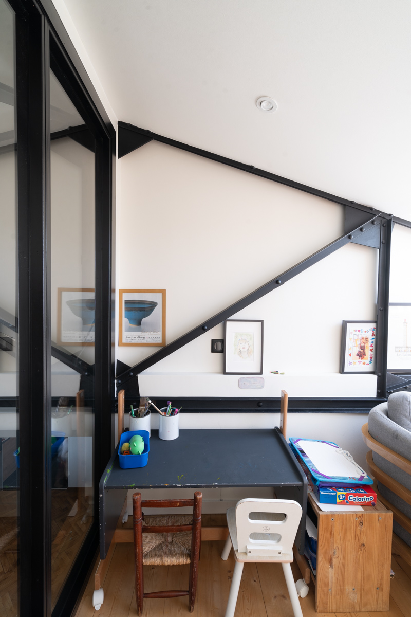 Une grande boîte vitrée ouverte sur le vide créé permet d’optimiser la luminosité et d’apporter une sensation d’espace. La réappropriation des combles a également révélé une partie de la charpente métallique existante, dont l’esthétique industrielle renforce le caractère du lieu.
