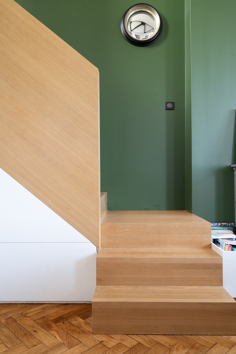 L’espace nuit, traité comme un volume distinct, se démarque par une teinte soutenue qui contraste avec le cachet ancien de l’appartement. Ce jeu de lignes et de couleurs apporte une touche contemporaine tout en respectant l’authenticité du lieu.