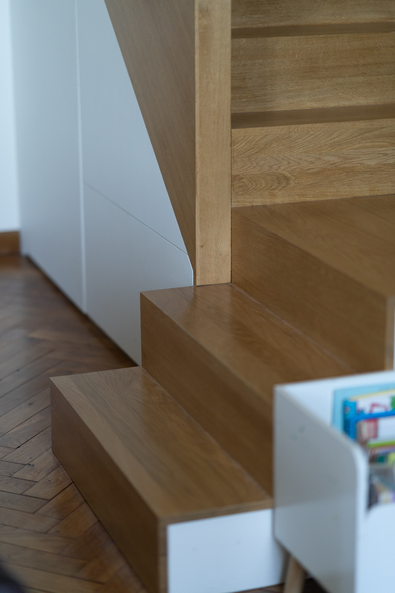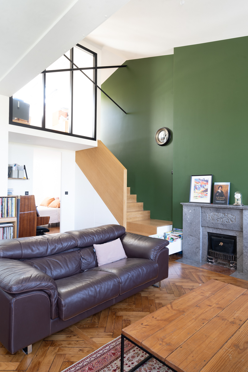 Situé au dernier étage sous les toits, l’appartement offrait la possibilité d’exploiter une double hauteur au-dessus du salon. Ce volume a été mis en valeur par la création d’une mezzanine, accessible via un escalier monolithique en bois brut intégrant des rangements dissimulés.