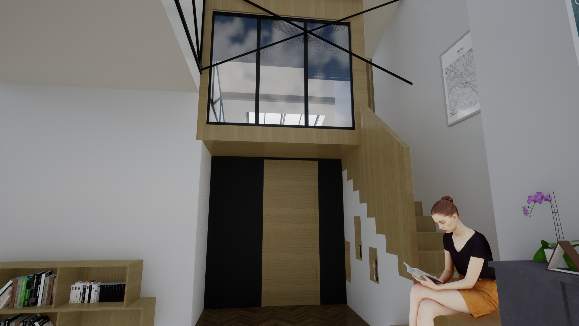 Caractéristiques du projet :Double Hauteur/Verrière/ Escalier monolithique en bois brut