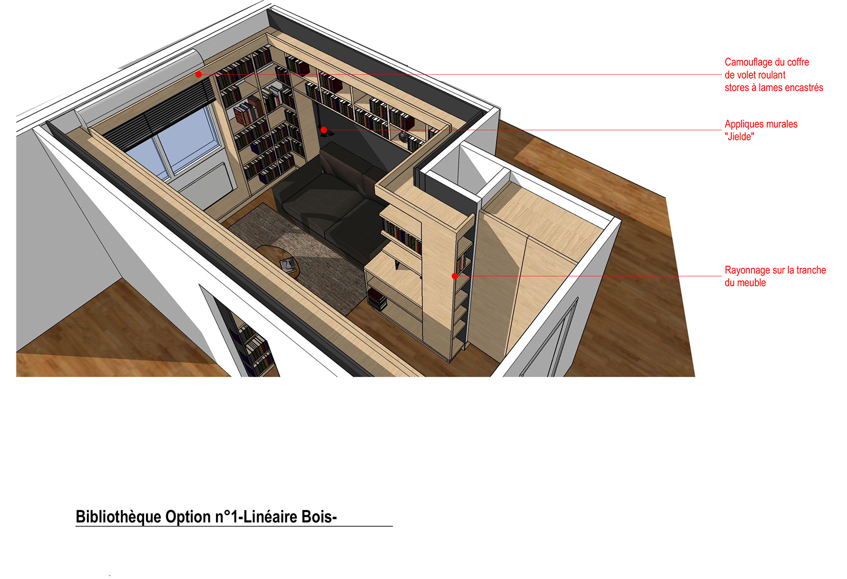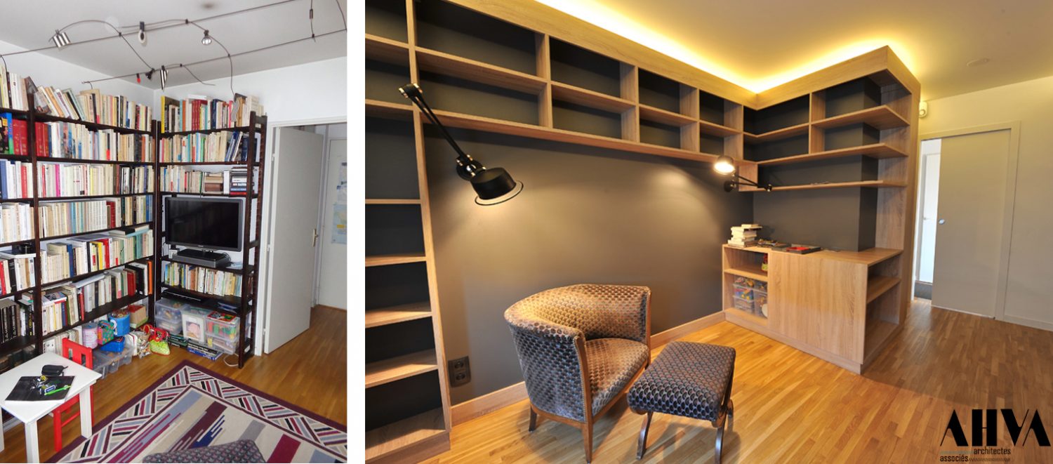 Pour cela, une cloison séparant la penderie et la bibliothèque existante a été déposée afin d’ouvrir l’espace. La nouvelle bibliothèque s’étend sur l’ensemble des murs et intègre un mobilier sur mesure, offrant un équilibre entre fonctionnalité et esthétique.