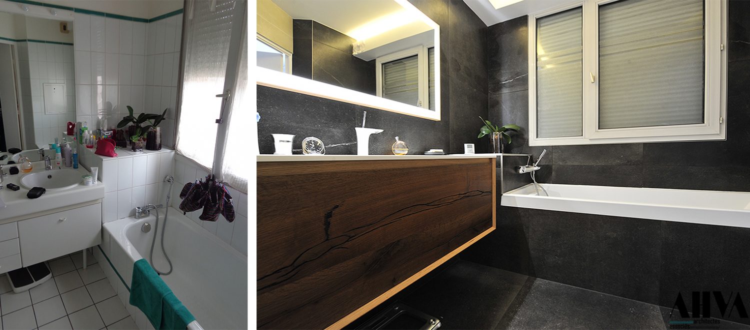 Rénovation en parallèle de la salle de bain du logement sur la base d’une ambiance sombre avec du mobilier en bois brut.