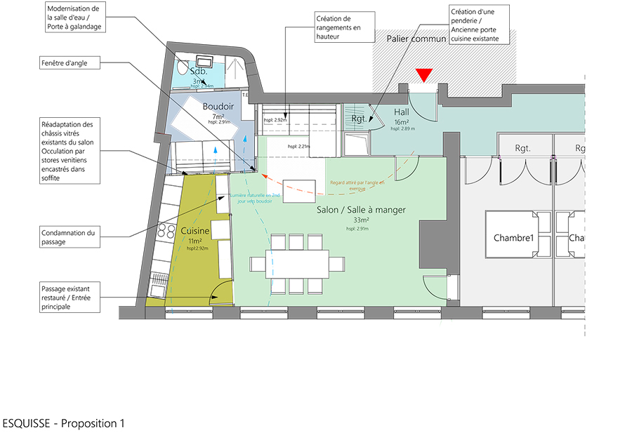 L’aménagement retenu avance légèrement le volume de l’espace nuit sur le salon, permettant d’optimiser les proportions et d’intégrer les verrières récupérées dans la cloison séparant la cuisine. Cette disposition apporte un éclairage en second jour au nouvel espace nuit tout en préservant son intimité.
