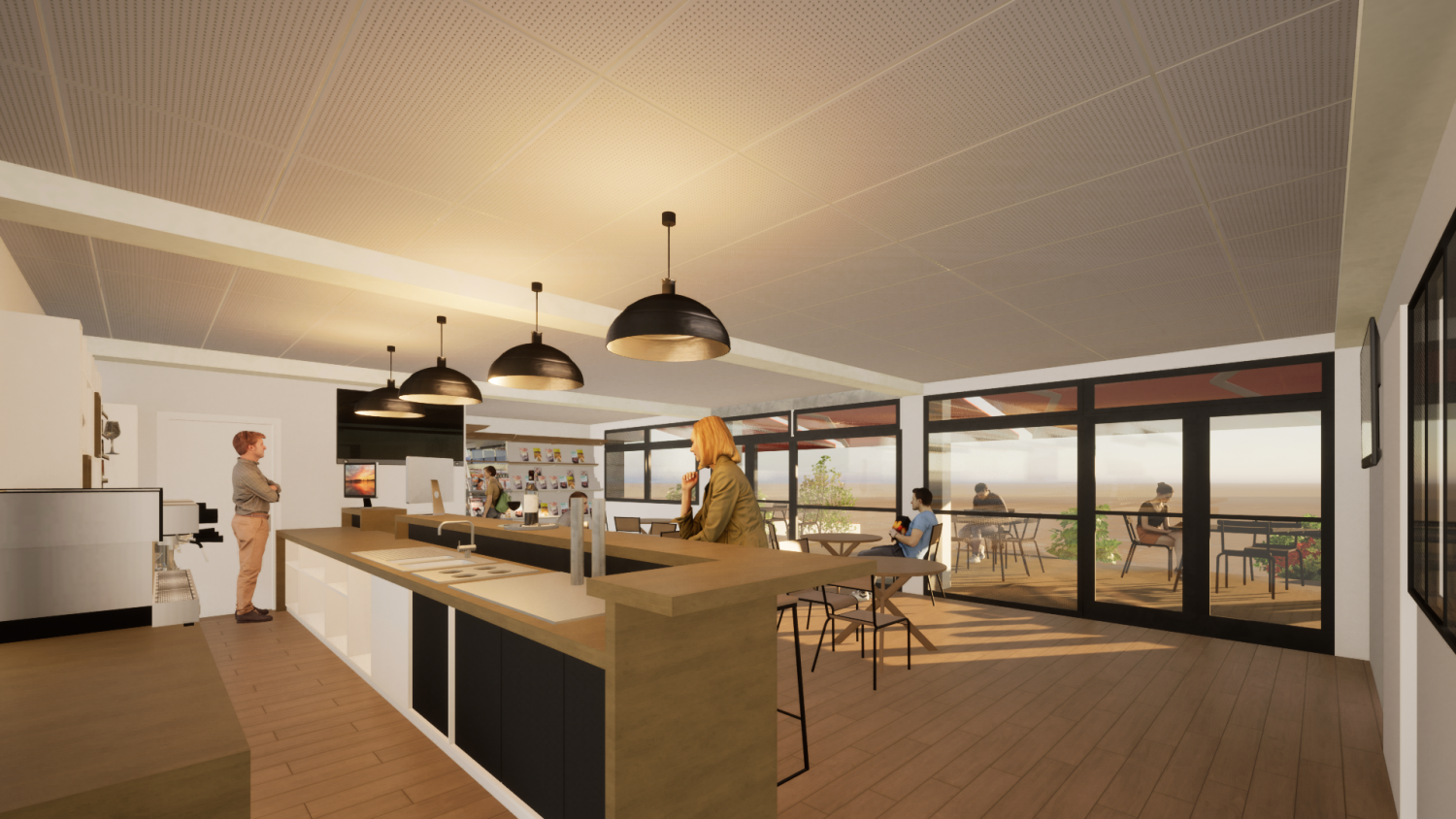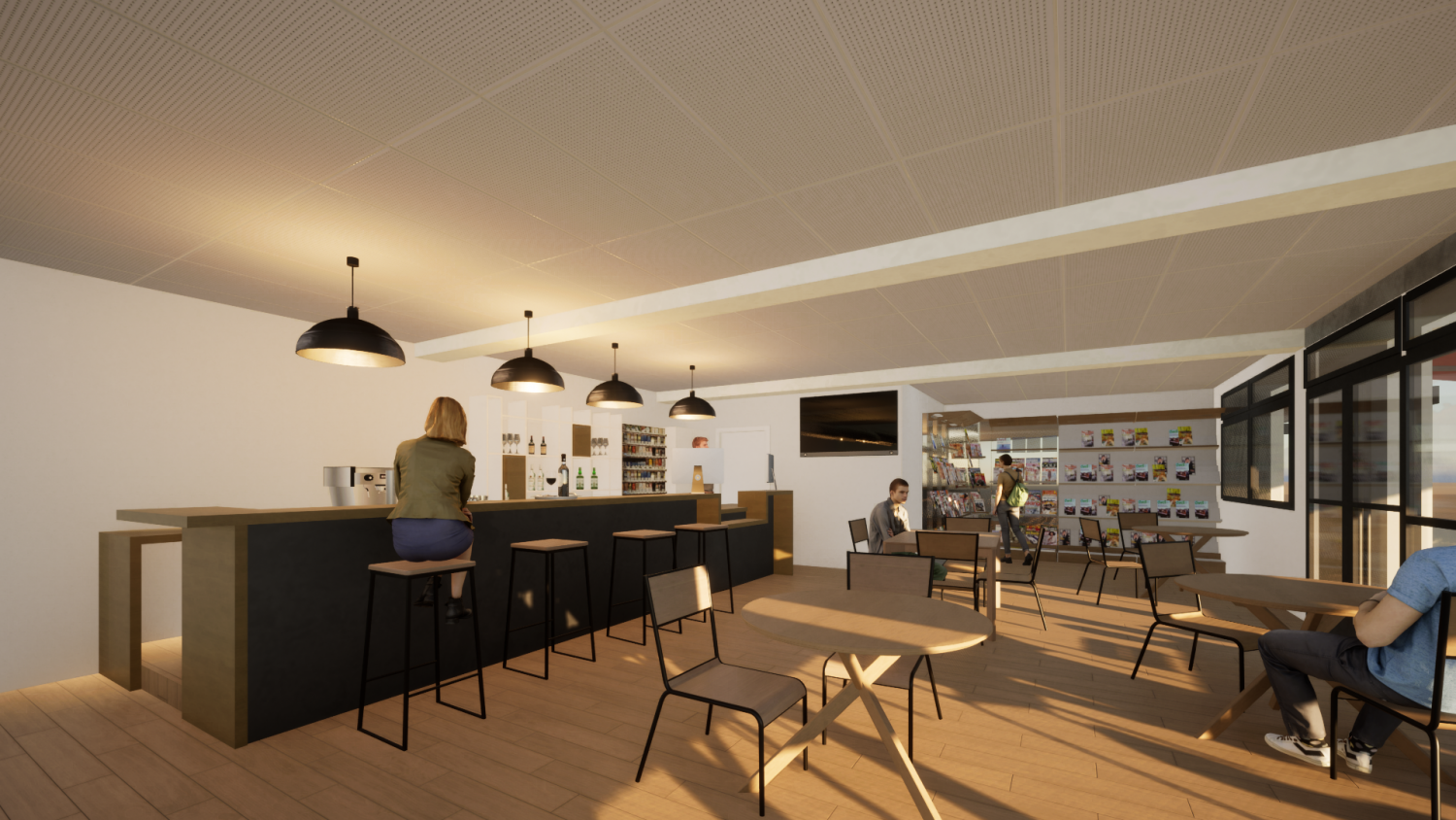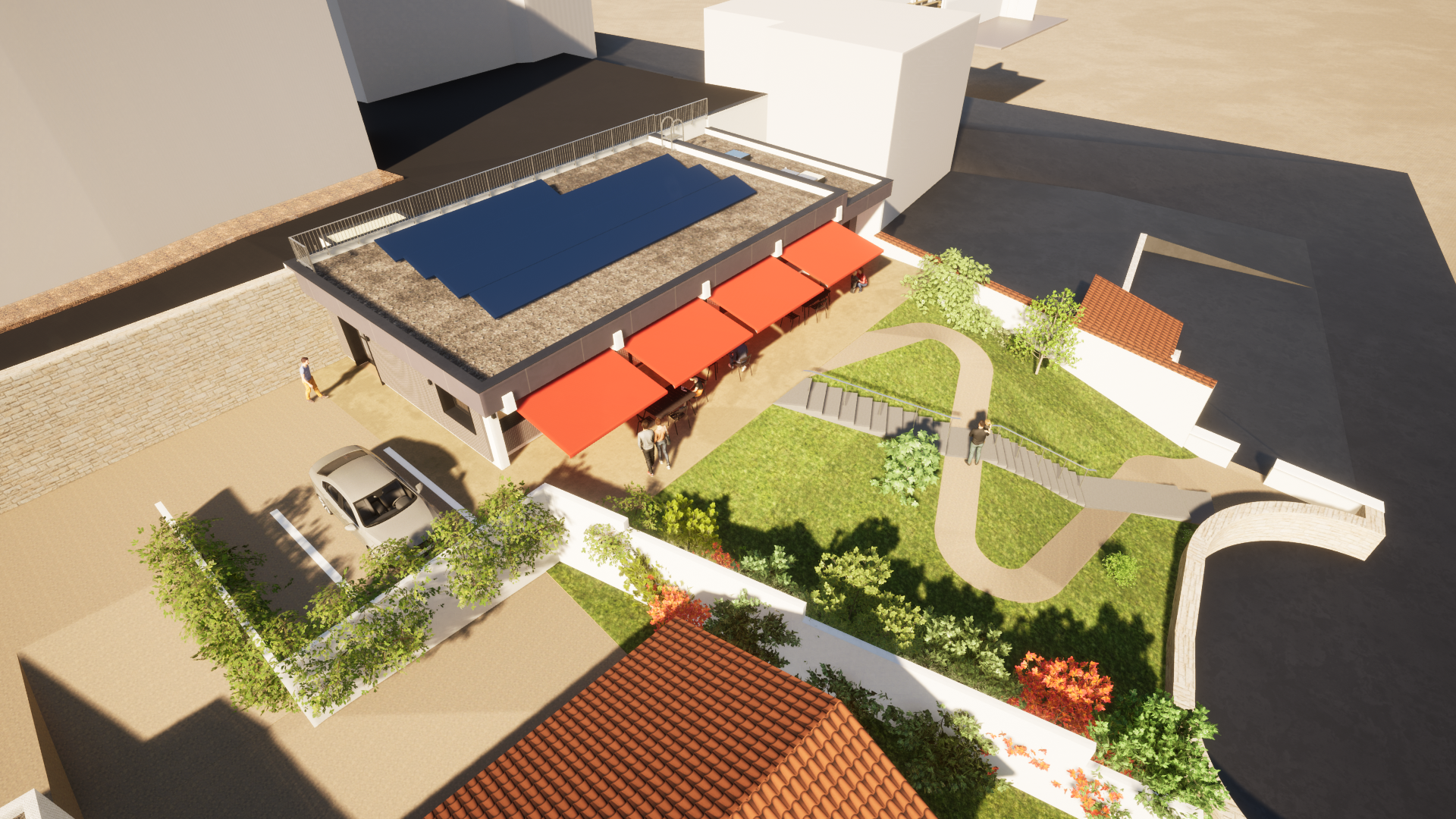 L’intervention ne se limite pas au bâtiment : les abords sont également repensés pour favoriser la convivialité et l’accessibilité. Une terrasse de 90 m², en prolongement du bâtiment au sud, offrira un espace agréable pour les clients du bar. En contrebas, un jardin paysager avec une zone arborée, un escalier et une pente douce aménagée facilitera la liaison entre la place de la mairie au sud-est et la terrasse.