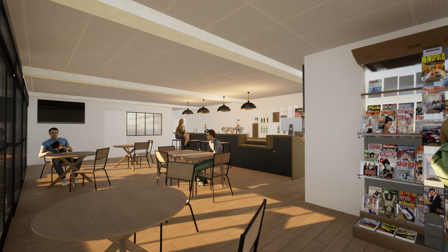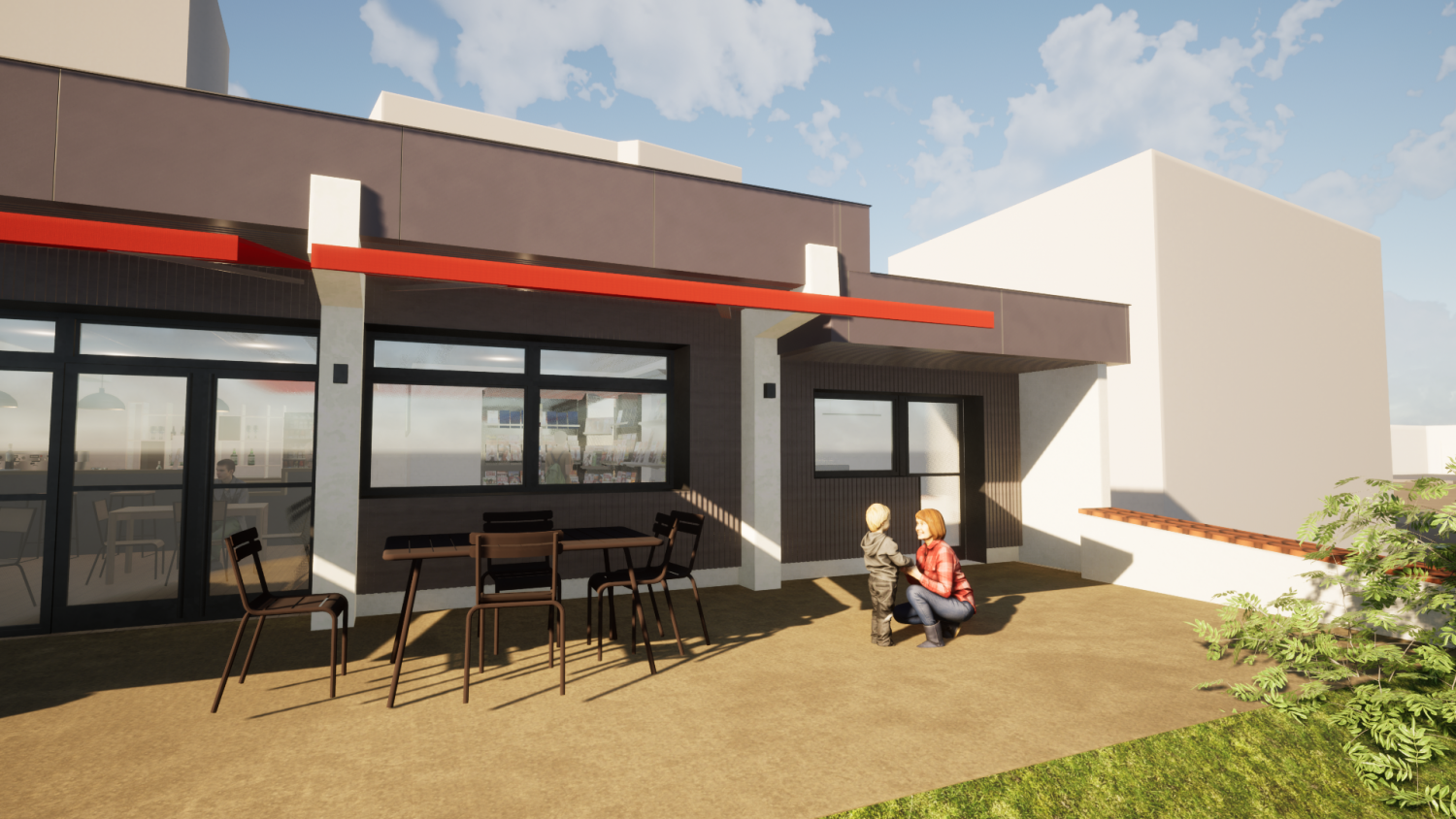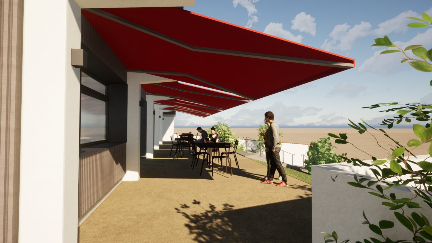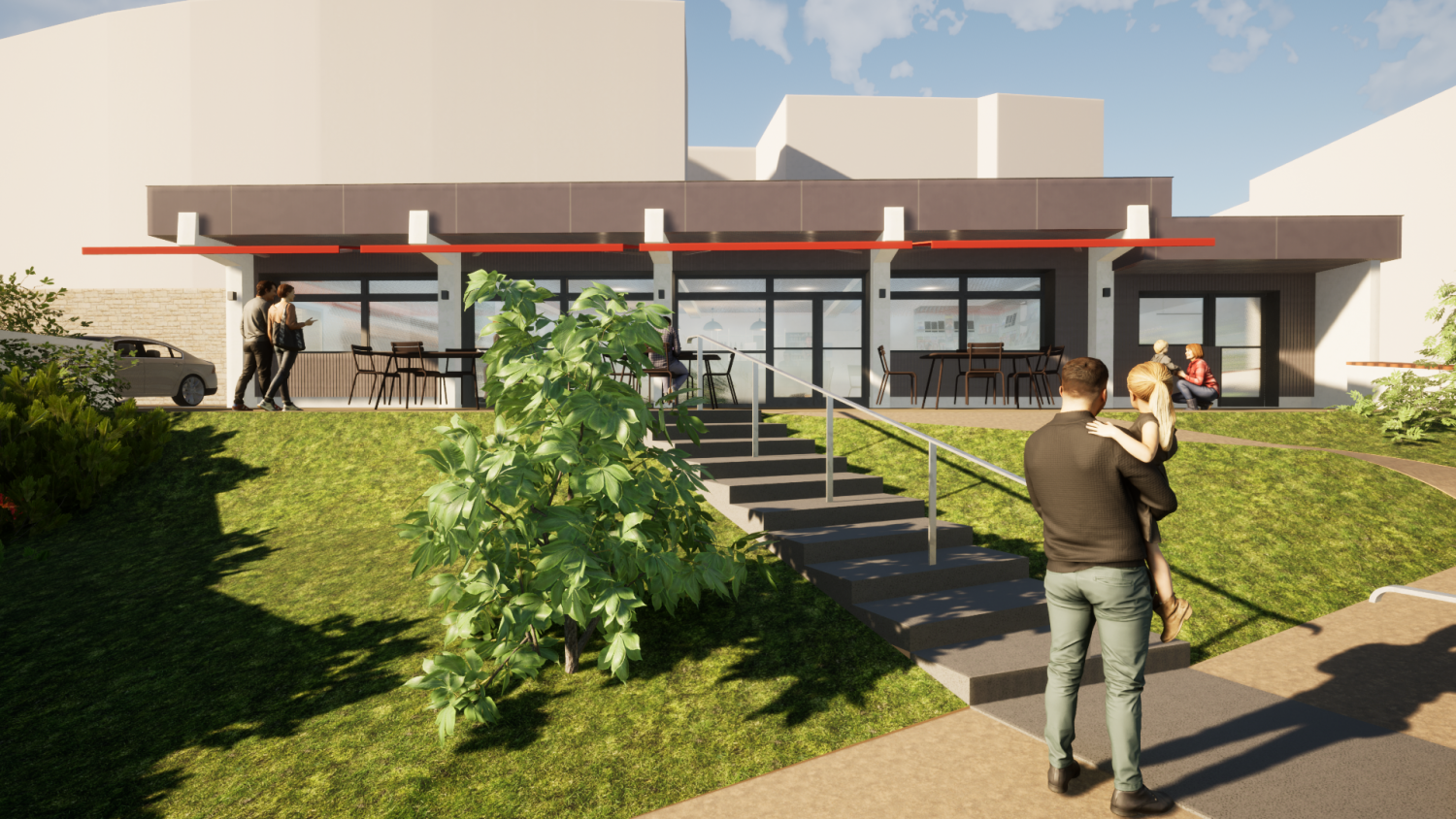 L’intervention ne se limite pas au bâtiment : les abords sont également repensés pour favoriser la convivialité et l’accessibilité. Une terrasse de 90 m², en prolongement du bâtiment au sud, offrira un espace agréable pour les clients du bar. En contrebas, un jardin paysager avec une zone arborée, un escalier et une pente douce aménagée facilitera la liaison entre la place de la mairie au sud-est et la terrasse.