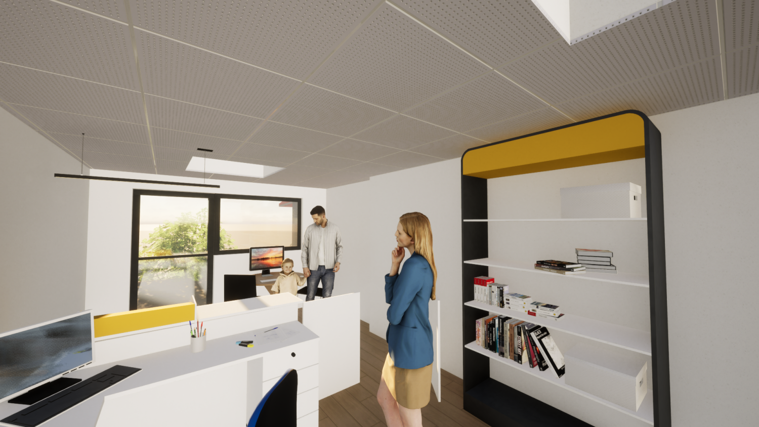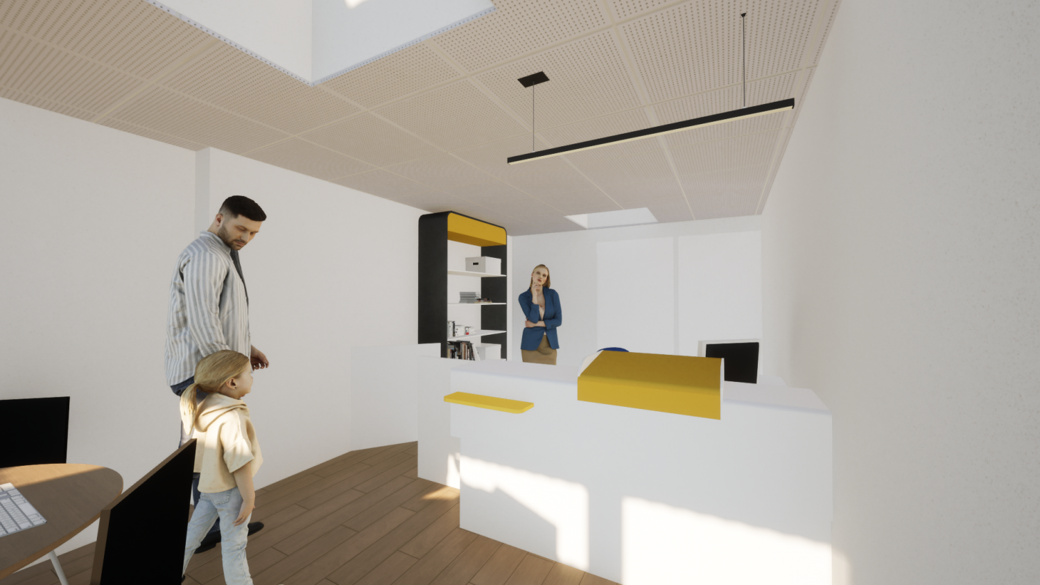 Espace public (9 m²) : accueil avec banque d’accueil et comptoir numérique.