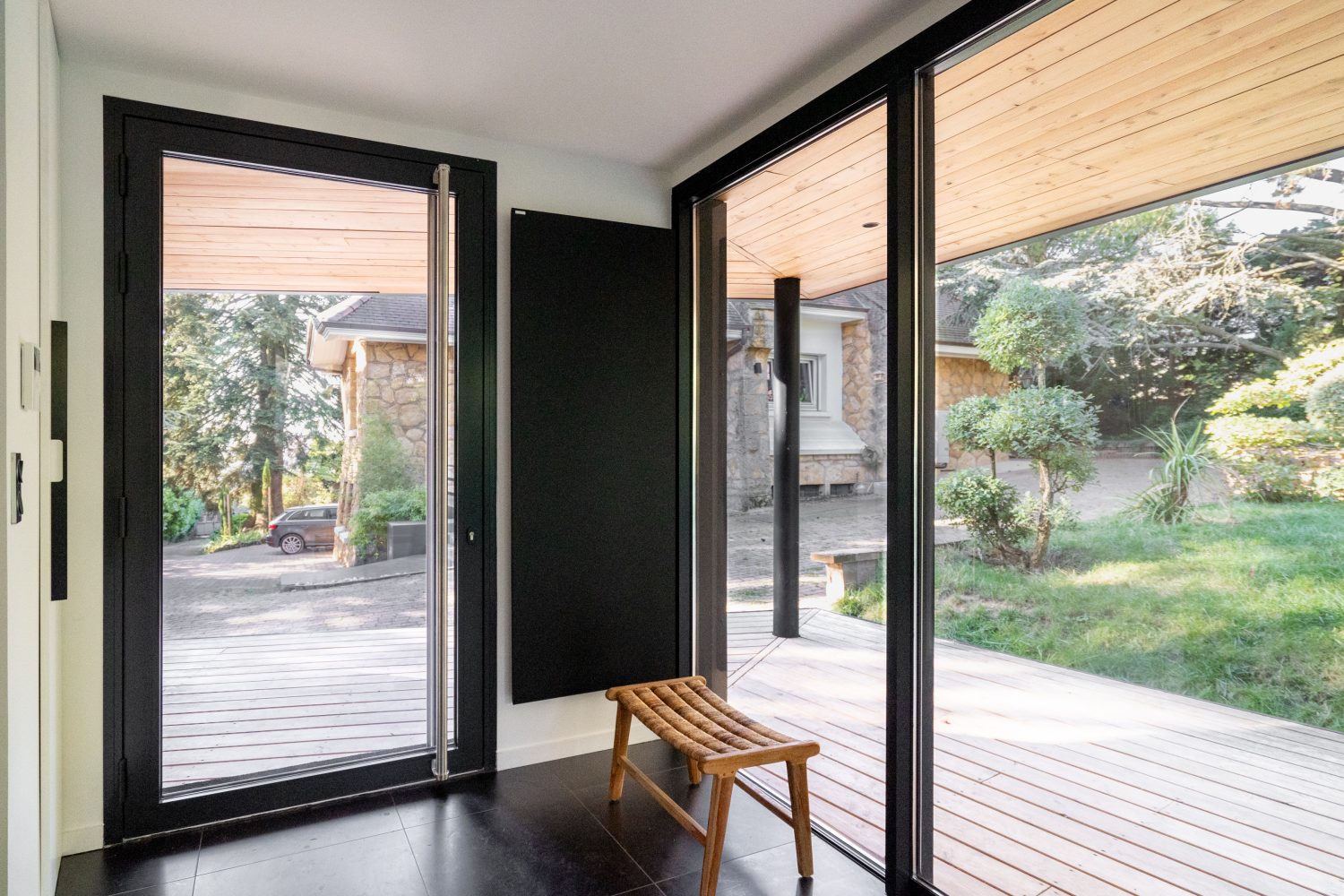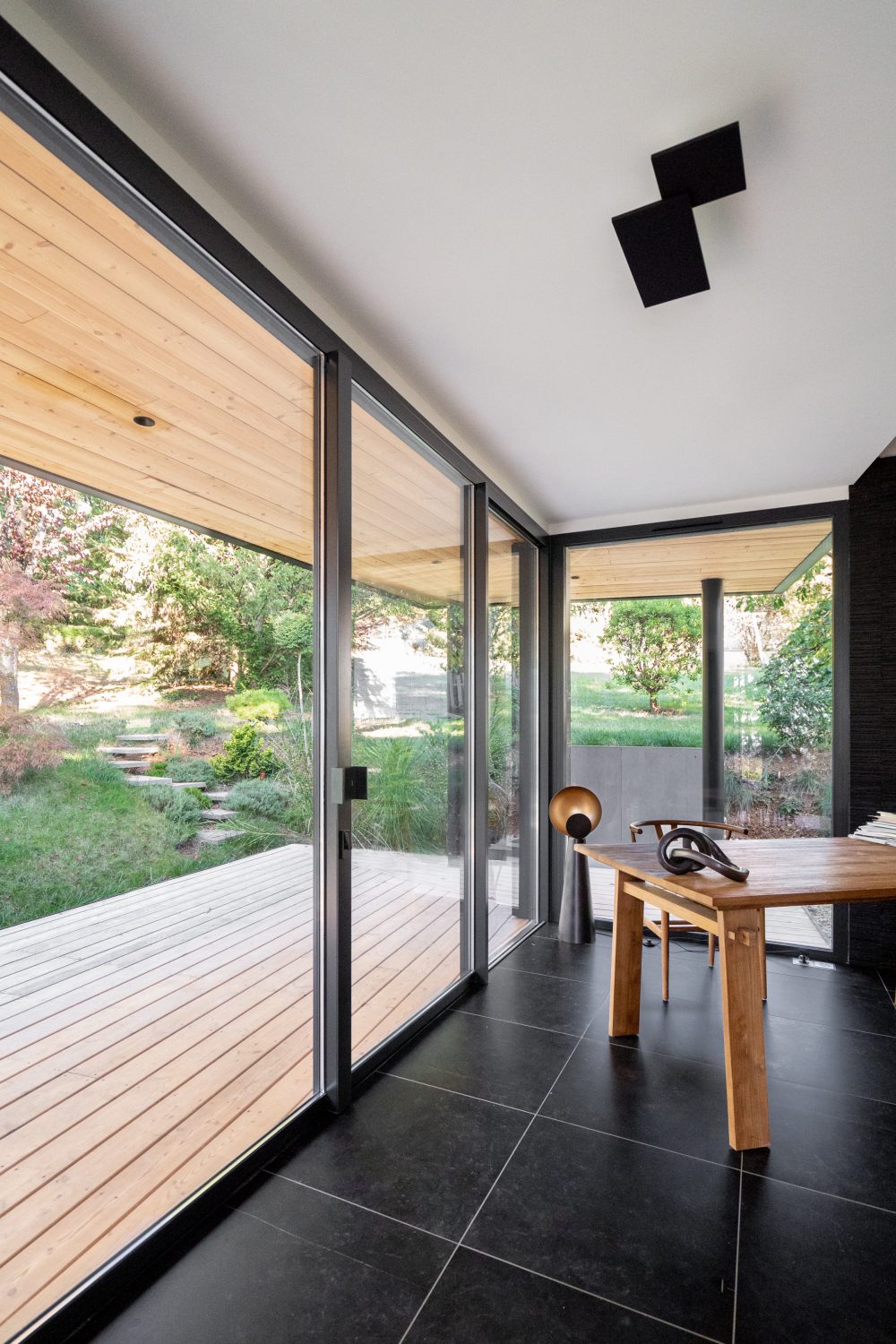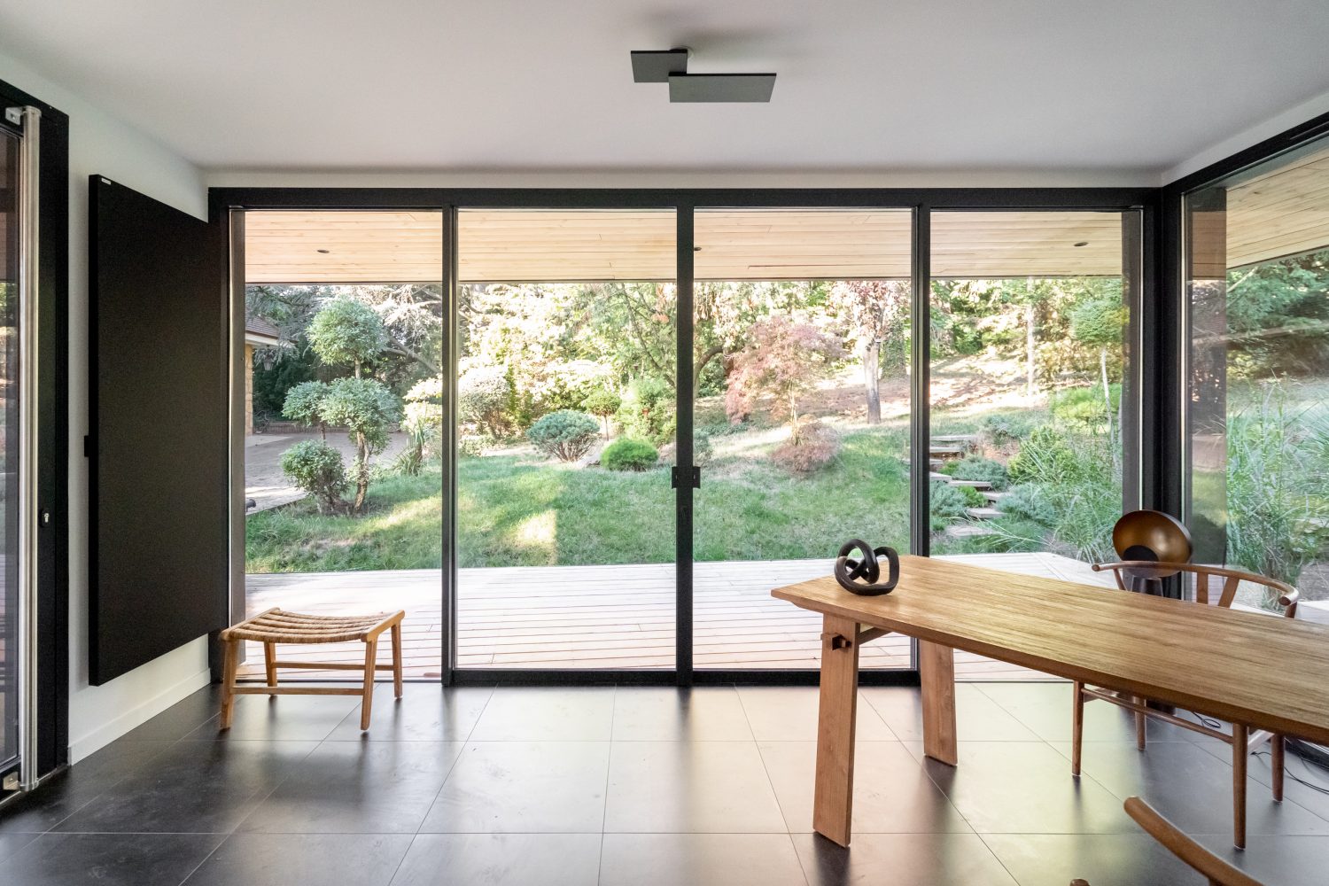 Un auvent métallique aux dimensions généreuses, en continuité avec une terrasse en bois, vient prolonger l’espace et offrir un abri fonctionnel. La sous-face en bois crée un jeu de matières qui accentue l’inspiration japonaise du lieu.