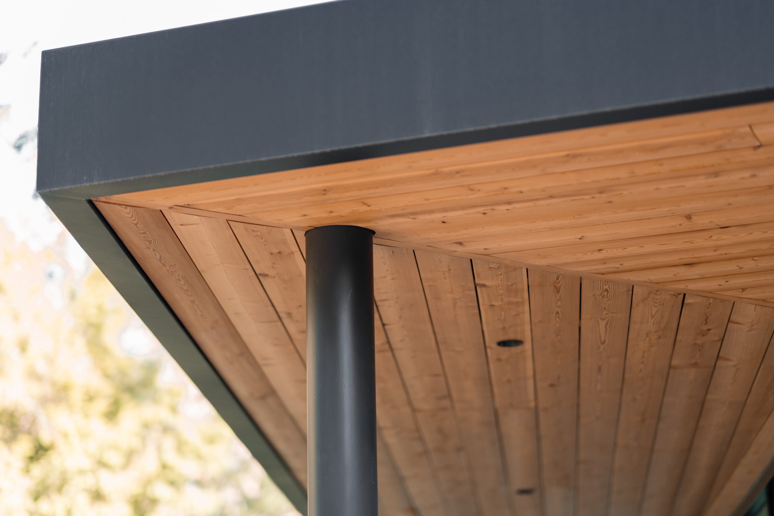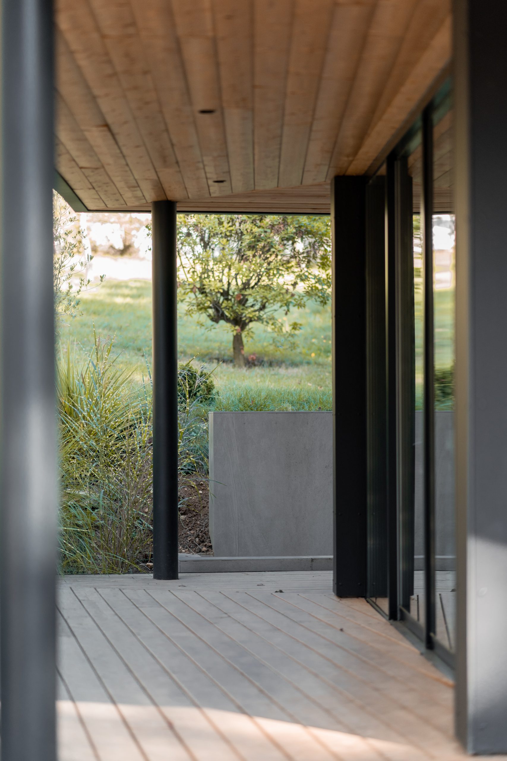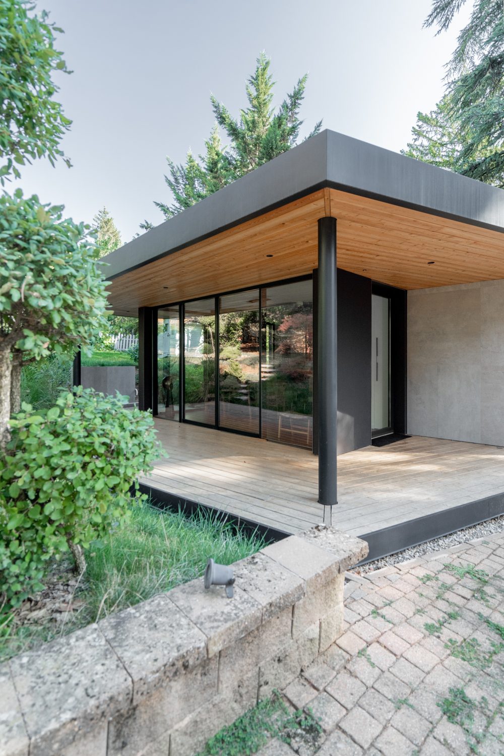 Un auvent métallique aux dimensions généreuses, en continuité avec une terrasse en bois, vient prolonger l’espace et offrir un abri fonctionnel. La sous-face en bois crée un jeu de matières qui accentue l’inspiration japonaise du lieu.