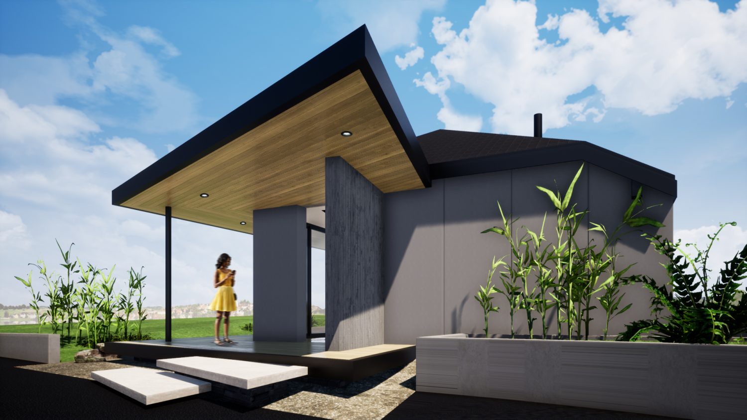 Pour donner à cette transformation un caractère affirmé, nous avons privilégié des lignes simples et épurées, en contraste avec la maison existante. L’ensemble des façades est habillé d’un bardage minéral Eternit foncé, renforçant la sobriété et l’élégance du projet.