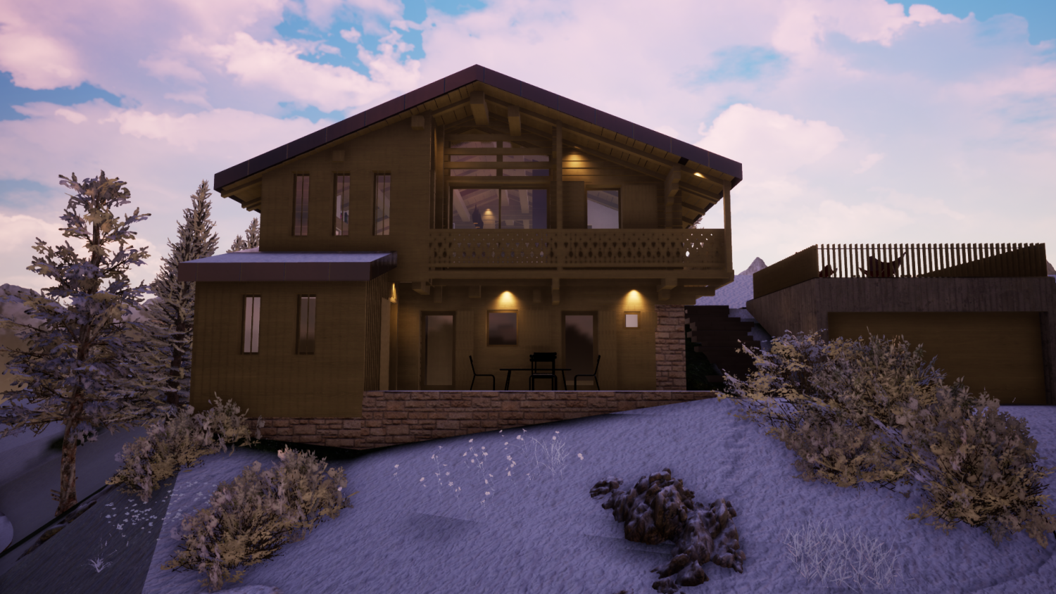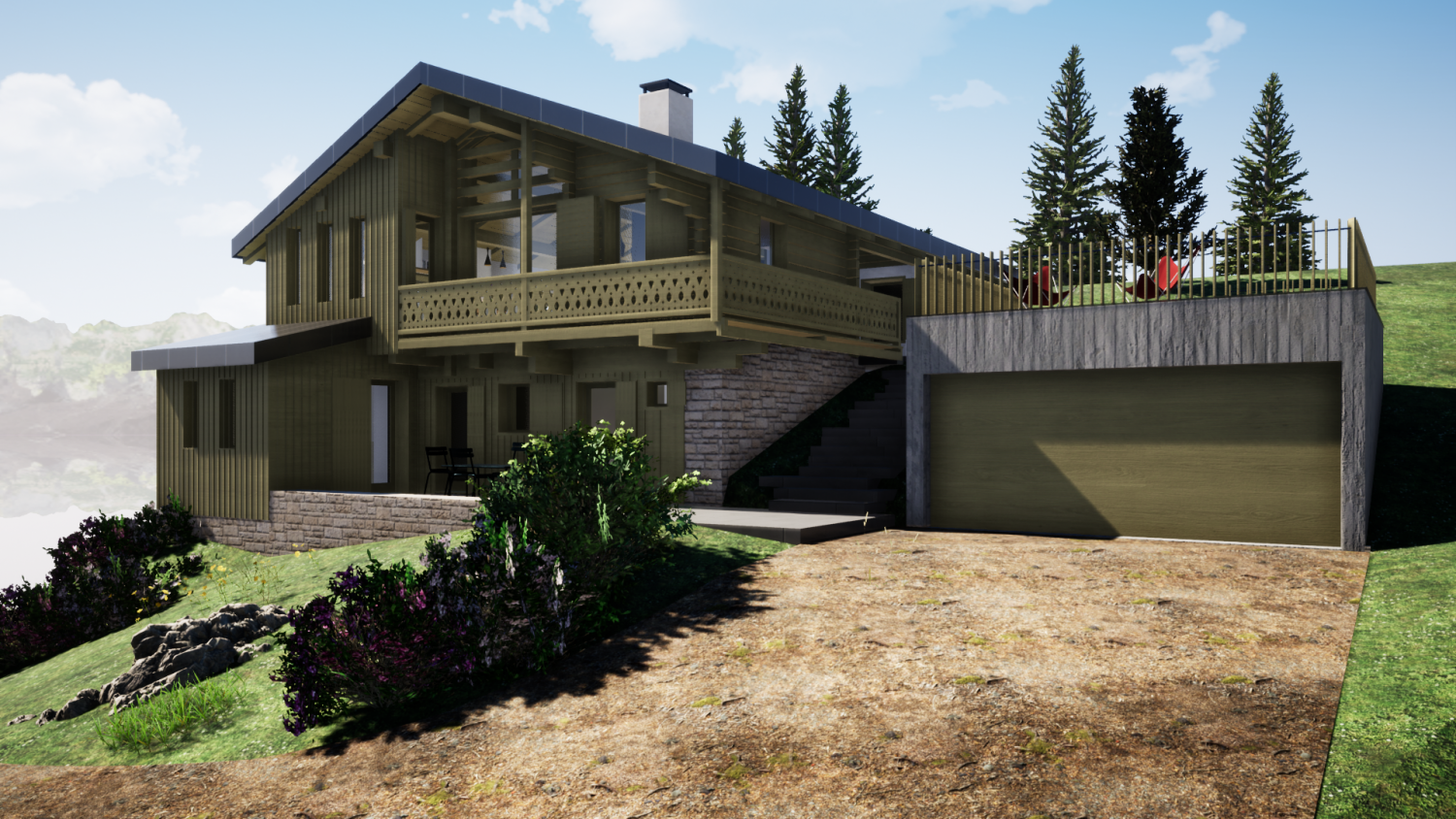 L’ajout d’un garage, implanté côté Sud-Ouest, s’est fait dans la continuité du terrain, en minimisant son impact visuel. Niché dans la pente, il est surmonté d’une toiture terrasse végétalisée accessible, favorisant son intégration paysagère. Son écriture contemporaine fait écho au chalet existant par sa volumétrie et le choix des matériaux : murs en béton banché avec un aspect bois, couvertines en ardoise et garde-corps harmonisés avec ceux du chalet.