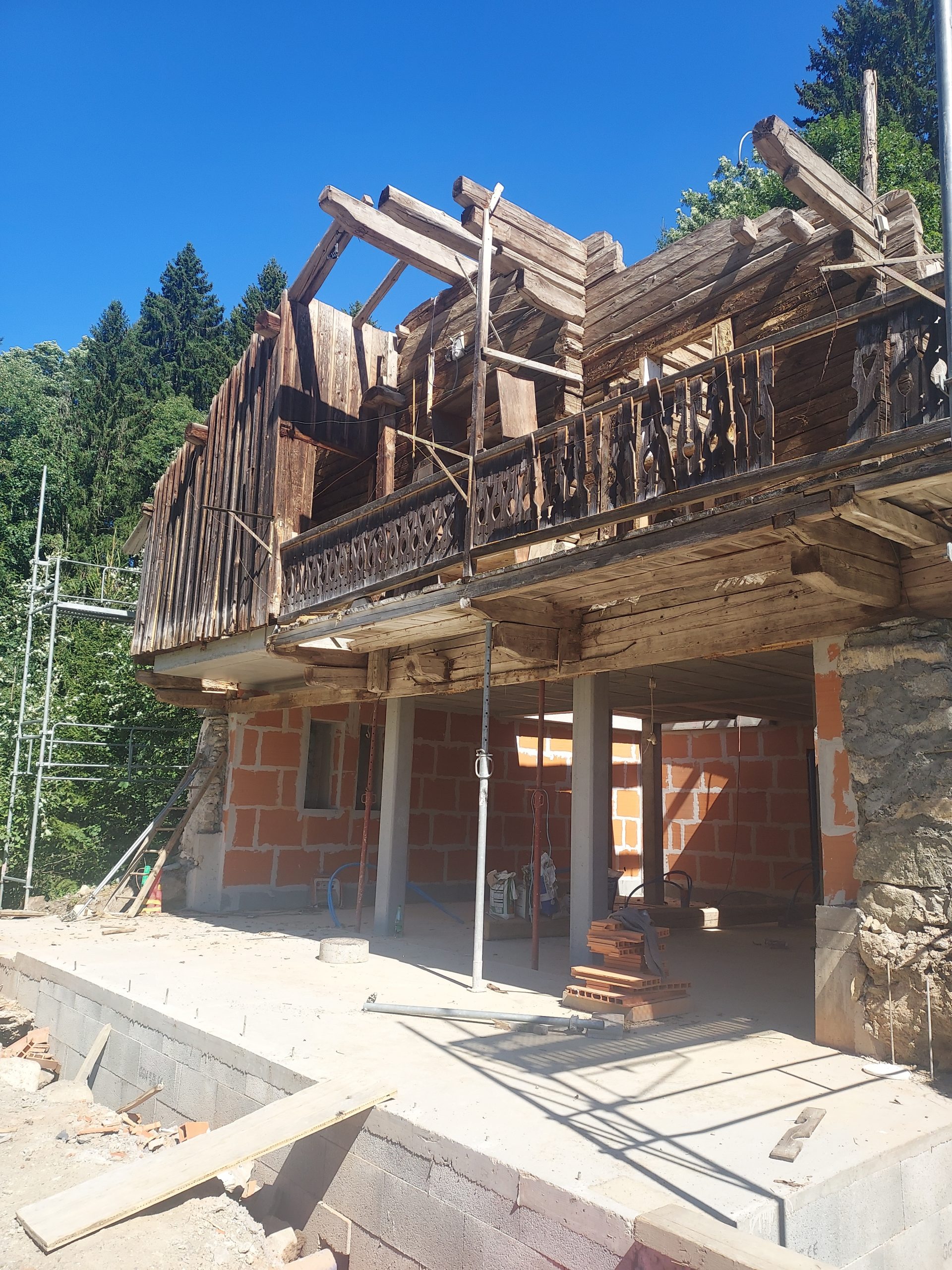Malgré la rénovation de la toiture, son épaisseur d’origine et ses voliges ont été préservées afin de conserver l’esthétique traditionnelle du chalet. Le soubassement en pierre a quant à lui été restauré avec un enduit au mortier de chaux, respectant les teintes naturelles du site.