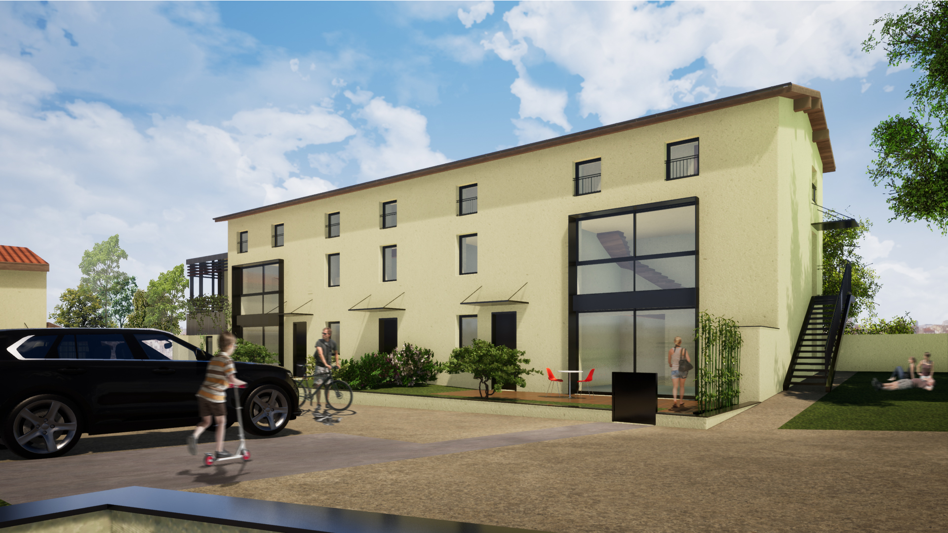 Ce bâtiment, anciennement un garage en R+1, a été transformé en maison de ville de typologie T4, avec jardin privatif et terrasse.