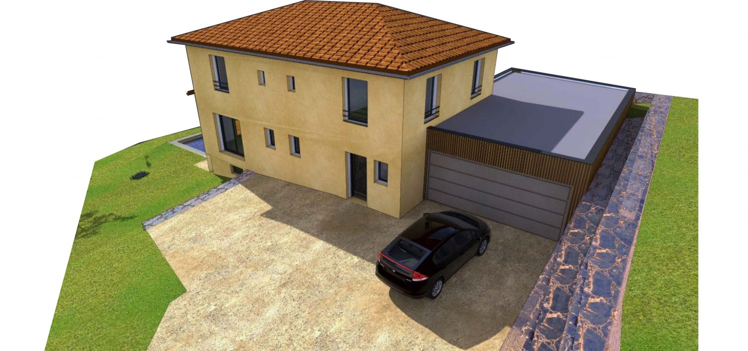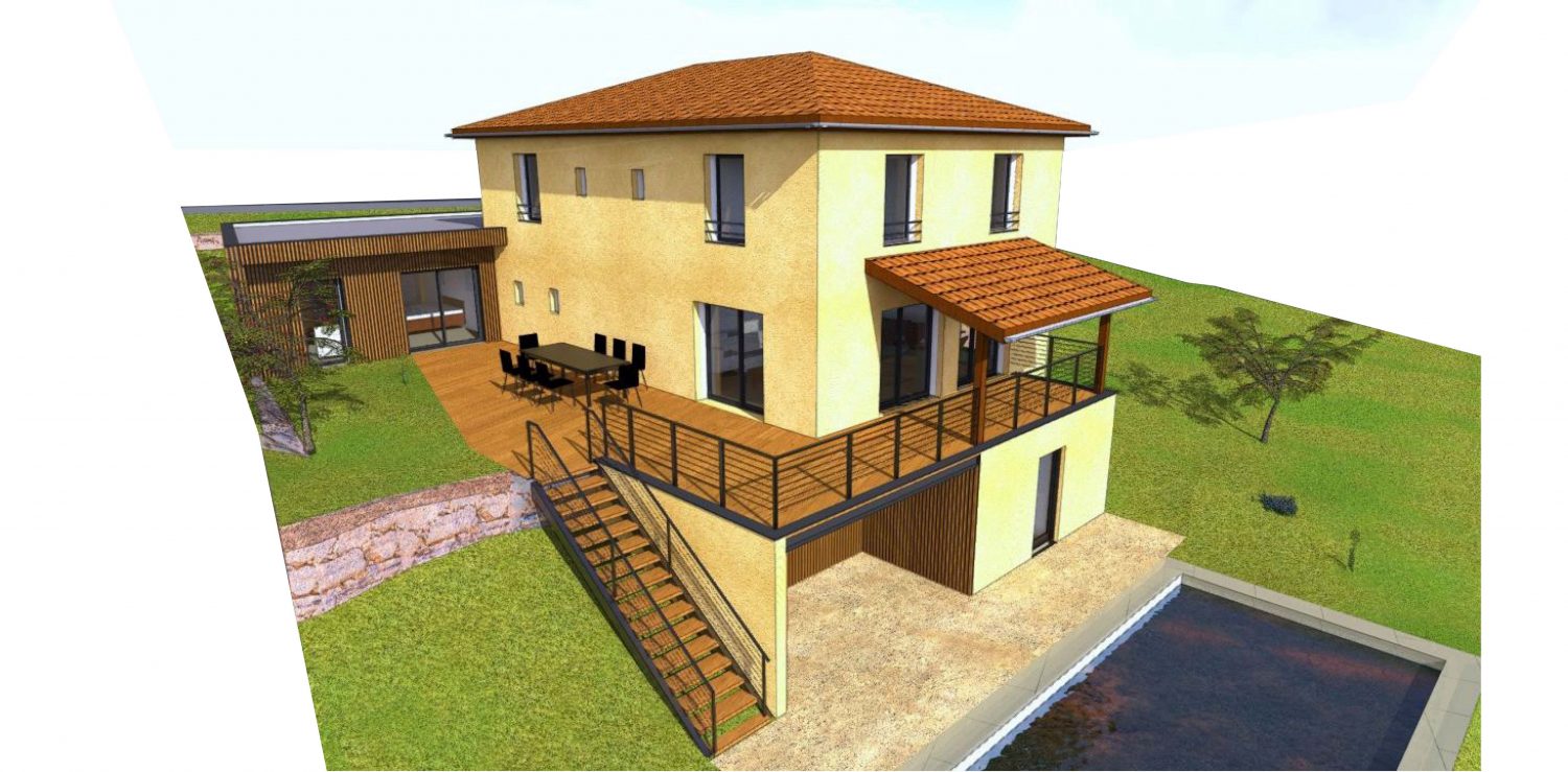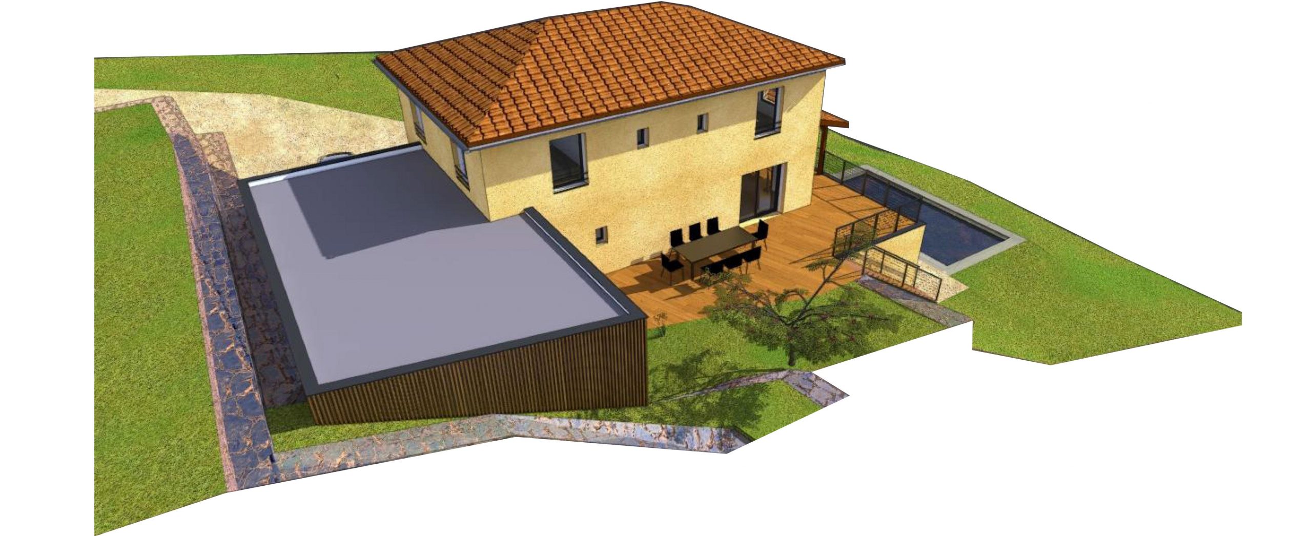 Nos clients, propriétaires d’une maison implantée sur un terrain en forte pente, souhaitaient agrandir leur terrasse pour mieux profiter des extérieurs et créer un lien harmonieux entre leur habitation, le paysage du vignoble beaujolais et leurs espaces de vie. Leur projet incluait également l’aménagement d’une piscine et la création d’une extension regroupant un garage couvert et une chambre supplémentaire.