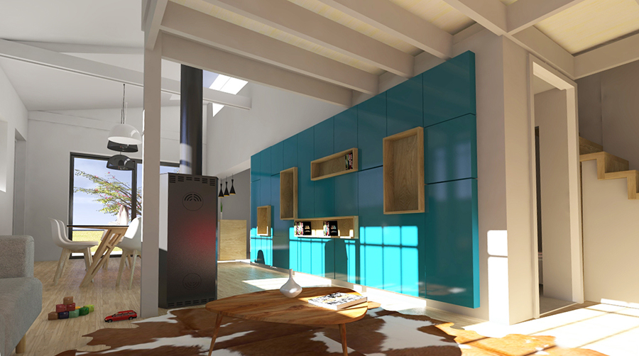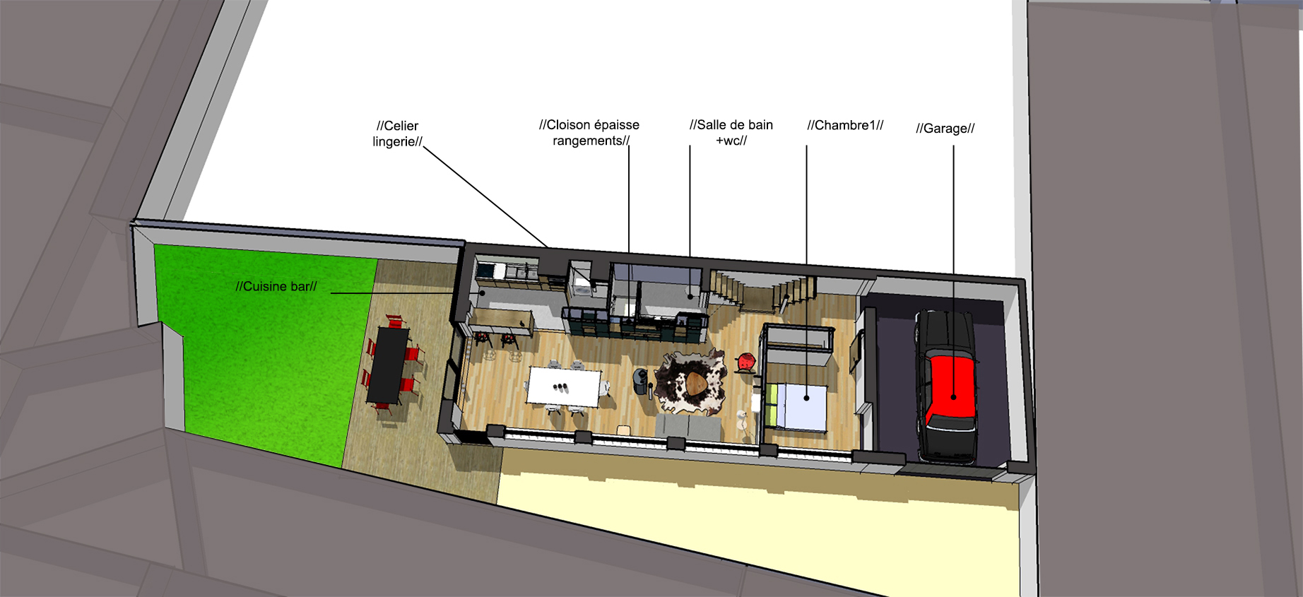 L’architecture intérieure a été pensée pour exploiter au mieux les spécificités du bâtiment. Une bande technique longe le mur aveugle, intégrant cuisine, cellier, rangements, salle de bain, sanitaires et circulations verticales. Cette disposition libère l’espace principal, tout en assurant une connexion fluide avec le garage accessible de l’intérieur comme de l’extérieur.