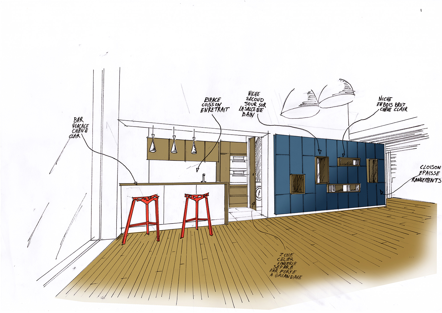 Les pièces de vie, baignées de lumière, profitent des fenêtres industrielles d’origine et d’un apport zénithal grâce à la réhabilitation de la verrière existante. Une cloison épaisse, intégrant des rangements et des niches en menuiserie, structure l’espace du salon.