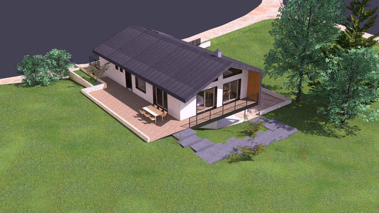 Les pièces de vie sont maintenues à l’étage, renforçant la cohérence du projet. Une seconde terrasse, implantée à l’Ouest, prolonge les espaces intérieurs vers l’extérieur. Le rez-de-chaussée accueille un garage, un local technique et une chambre tournée vers le Sud.