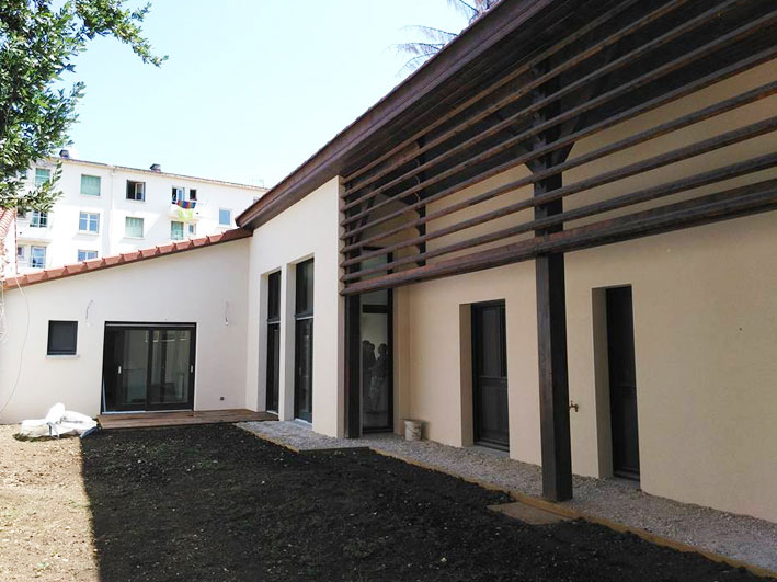 Des volumes en retrait, judicieusement implantés sur toute la largeur de la parcelle, permettent de dynamiser l’entrée et de conférer une certaine fluidité à l’ensemble du projet. L’agencement intérieur favorise une continuité avec l’espace extérieur grâce à un patio agrémenté d’un jardin et d’une terrasse en bois. Cet aménagement offre aux chambres et aux pièces de vie un cadre intime et protégé des regards du voisinage.