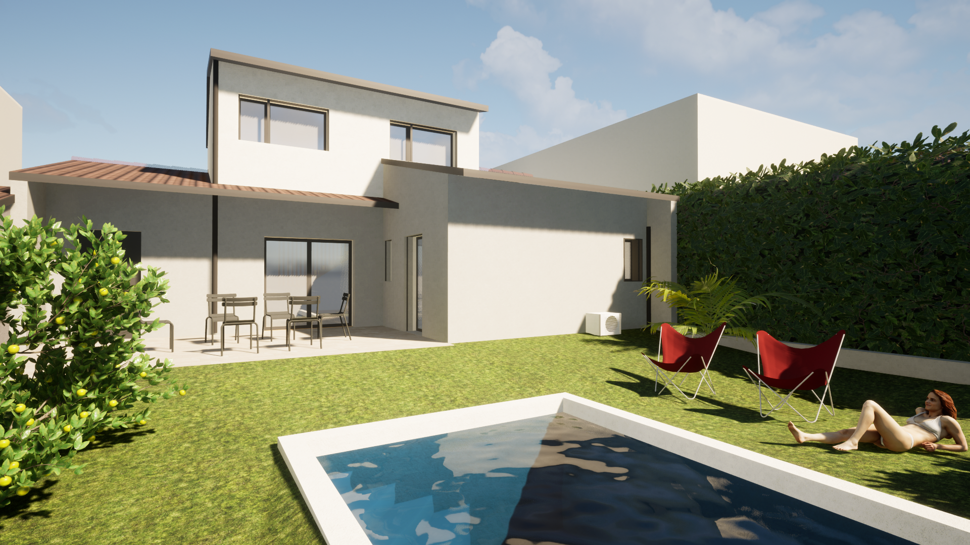 Le rez-de-chaussée, en forme d’équerre, s’implante sur les deux mitoyennetés et libère une cour en façade sud, permettant le stationnement de deux véhicules. À l’arrière, un jardin paysager et une piscine prolongent l’espace de vie extérieur.