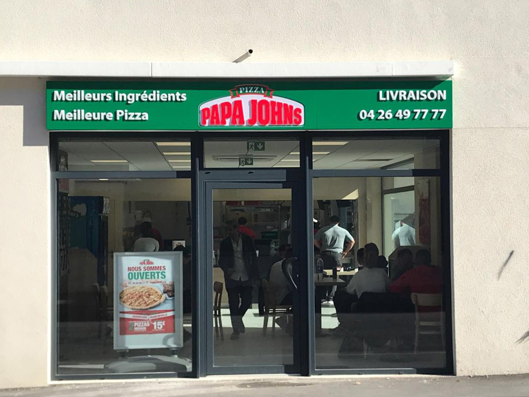Le défi était également de préserver l’identité visuelle de l’enseigne tout en respectant les contraintes architecturales du bâtiment neuf. La signalétique et les codes esthétiques de Papa John’s ont été intégrés de manière fluide, garantissant une parfaite cohérence avec l’image de marque et l’environnement urbain du quartier.